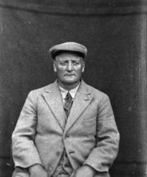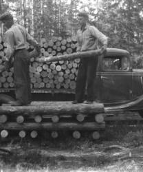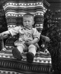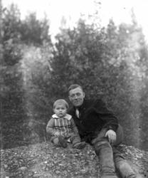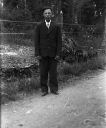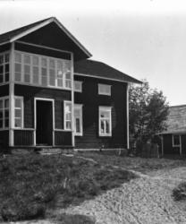 Oik. seisoo Vihtori Katajamäki, keskellä istuu Jussi Lamminaho, edessä myymälänhoitaja Vappulan tytär. Töysän aseman Osuuskauppa Hakojärvellä (löytyy kansiosta).