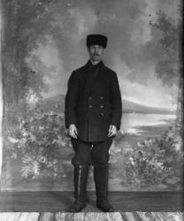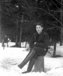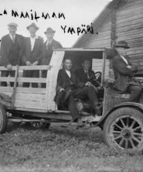 Jaakko Pelnaderin "hoppa" 1920-luvun alkupuolelta. Konepellillä Matti Heikkola, kopissa Verner Vanhamäki ja Eino Lamminaho, lavalla Artturi Mäkiranta, Artturi Ylimäki ja Erkki Saarimäki (kuvateksti Töysän Joulusta -79)