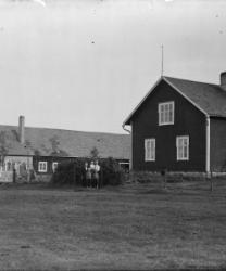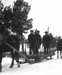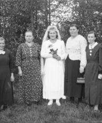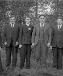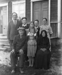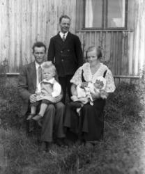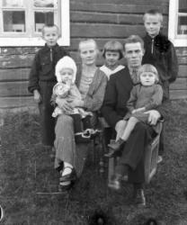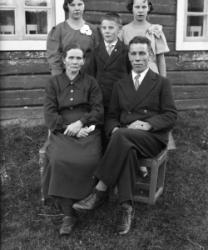 "Matti Kortesmäki, takana oik. Tyyne, Jussi ja Raili Kortesmäki, raitapuseroissa Pauli ja Pentti Kortesmäki,