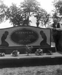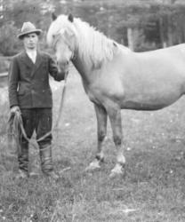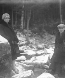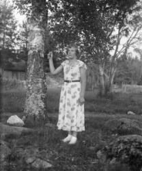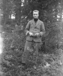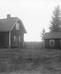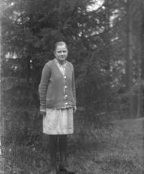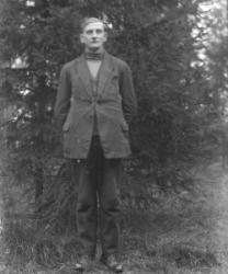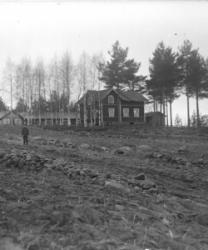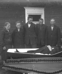 Juho Lamminaho, Hanna, Maija, Verner ja Teemu Vanhamäki, Nikodemuksen Liisa-vaimo arkussa. Toinen oik. Ida Lamminaho. Liisa oli kävellyt radalla ja jäänyt junan alle lähellä Töysän asemaa 31.5.-34, Liisa oli 80v. Kuva otettu Vanhamäen talon pihassa.