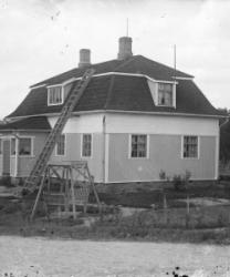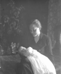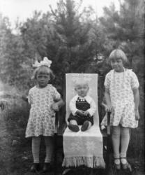 "Kutomakurssit Riihimäen talossa noin vuonna 1935-36. Edessä vasemmalta Aino Kukkola, keskellä Riihimäen isäntä sylissään