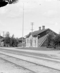 Töysän asemarakennus, taustalla pytinki, eli henkilökunnan asunnot ulkorakennuksineen, keskellä aseman makasiinrakennus ja oikeassa reunassa wc-rakennus, asema kolmiraiteinen.