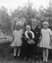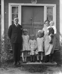 "Vasemmalta Alli Leskinen, Lahja Koskenaho, Aino Vuorenmaa, Viena Koskenaho Arvo Aho, Helmi Koskenaho, Matti Hakojärvi, Takana Virtasen talo (Virtanen)