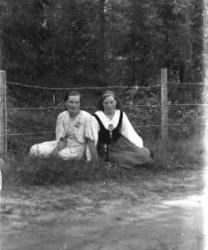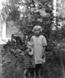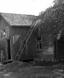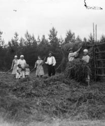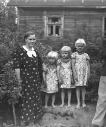 Mummeli lasten kanssa ehkä Hilma Maria Matintytär Rantala Mäntylä. Lapset Rauha Heikkola = Aho, Saima Heikkola = Valkama, keskellä Toini Jokinen (os. Lehtisaari), Väinö Jokinen. Haasiolla Eino Soilinen, Senja Mäntylä, Räntilä (os. Auraniemi).