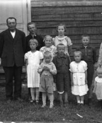 "Pelanderin perhe. Takarivi: Isä - Jaakko, Paavo, Taimi, Olavi, äiti - Helka. Eturivi: Aino, Aila, Kalevi, Arvo, Lilja.