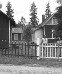 Perhe on asunut vanhalla Työväentalolla Hakojärvellä. Kuva otettu talon edessä."