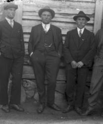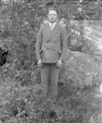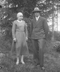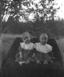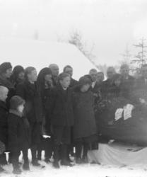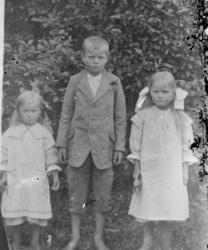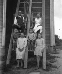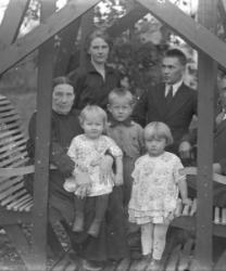 Tikapuilla vasemmalta Heikki, Unto, Maija Kuivasmäki. Oikealla palvelija, Viljo ja Kerttu Kuivasmäki.