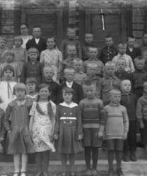 Opettaja: Fanny Koskimaa, Rauha Isoaho, Martta Housu, Erkki Lehonen, Laura Suomela, Meeri Saarikoski, Anna-Liisa Mäkelä, Paavo Ojala, Kerttu Virtanen, 1922-23-24 syntyneet koululaiset