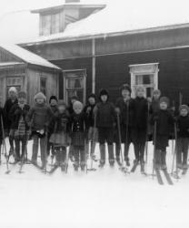 Koululaiset lähdössä hiihtämään. Kuvaajana Verner Vanhamäki