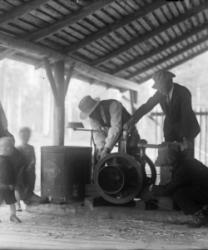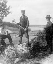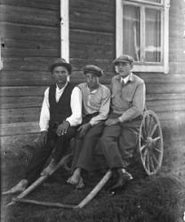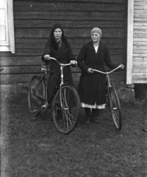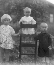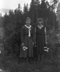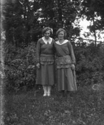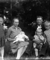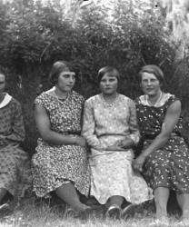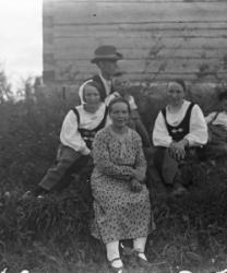 Kansallispukuiset opettajat Hilma Isotalo (Ruismäki) ja Elli Fräntilä (os. Sorila). Anna Holkko ent. Lahti-härkönen, takana Väinö Holkko, pojat Leo, sylissä Urho.