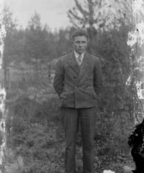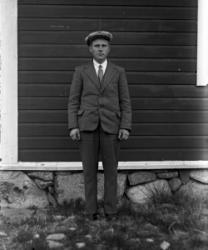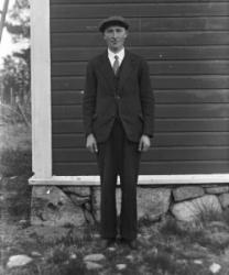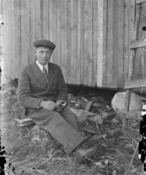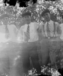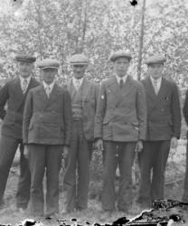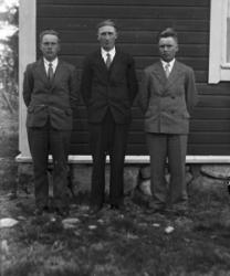 Vas. Eino Kukkola, kolmas vas. Jussi Kasari, toinen oik. Arvo Tohni. Takana Kukkolan talo.