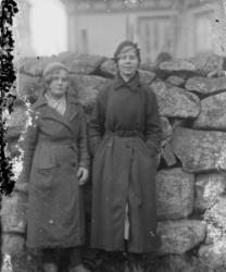 Naiset kirkon kivimuurin edessä, takana Töysän kirkko